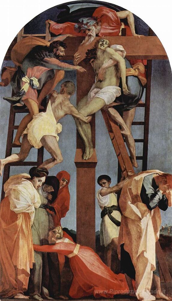 Ti offriamo una riproduzione artigianale su tela dell'opera famosa 'Deposizione' di Rosso Fiorentino, dal Museo delle Riproduzioni.