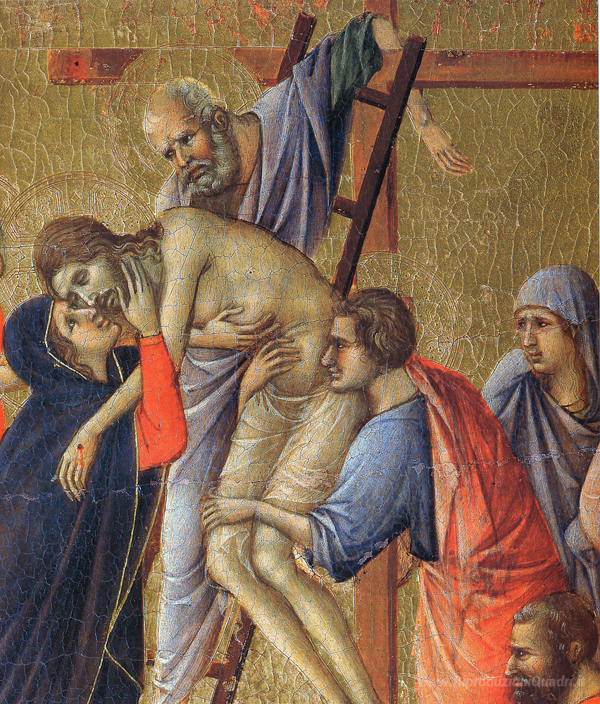 Ti offriamo una riproduzione artigianale su tela dell'opera famosa 'Discesa dalla Croce (frammento)' di Duccio, dal Museo delle Riproduzioni.