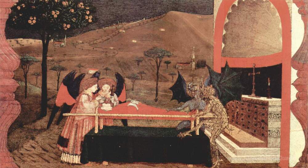 Ti offriamo una riproduzione artigianale su tela dell'opera famosa 'Due angeli e due diavoli' di Paolo Uccello, dal Museo delle Riproduzioni.