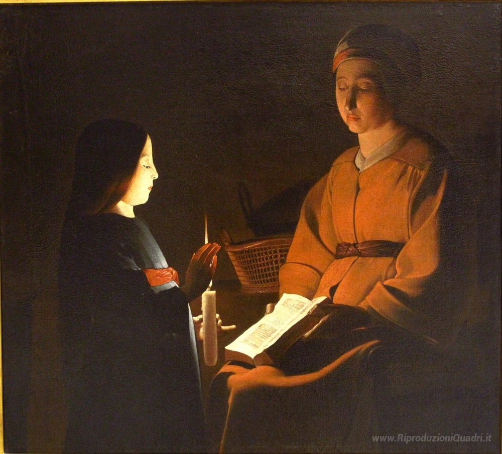 Ti offriamo una riproduzione artigianale su tela dell'opera famosa 'Educazione della Vergine' di Georges de la Tour, dal Museo delle Riproduzioni.
