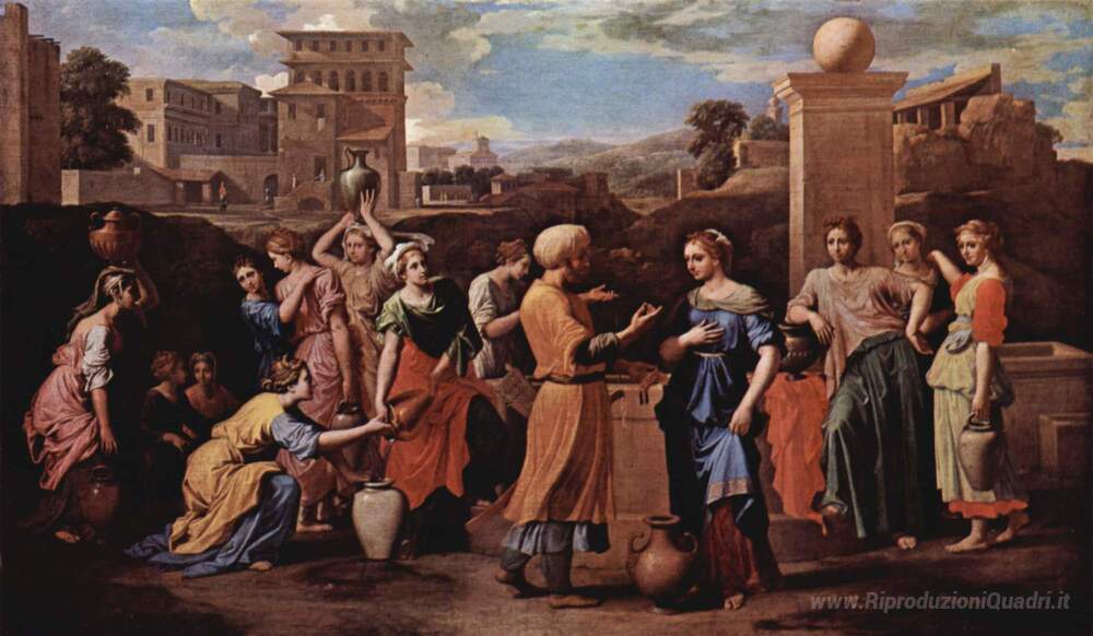 Ti offriamo una riproduzione artigianale su tela dell'opera famosa 'Eliezer e Rebecca al pozzo' di Nicolas Poussin, dal Museo delle Riproduzioni.