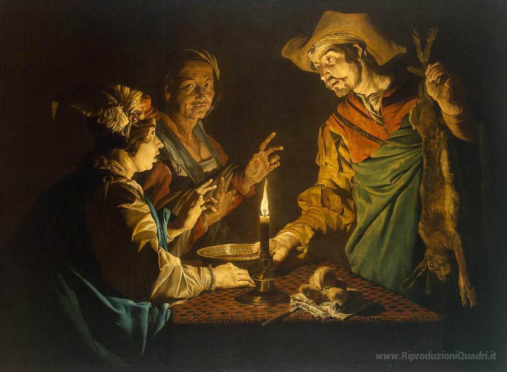 Ti offriamo una riproduzione artigianale su tela dell'opera famosa 'Esaù e Giacobbe' di Matthias Stom, dal Museo delle Riproduzioni.