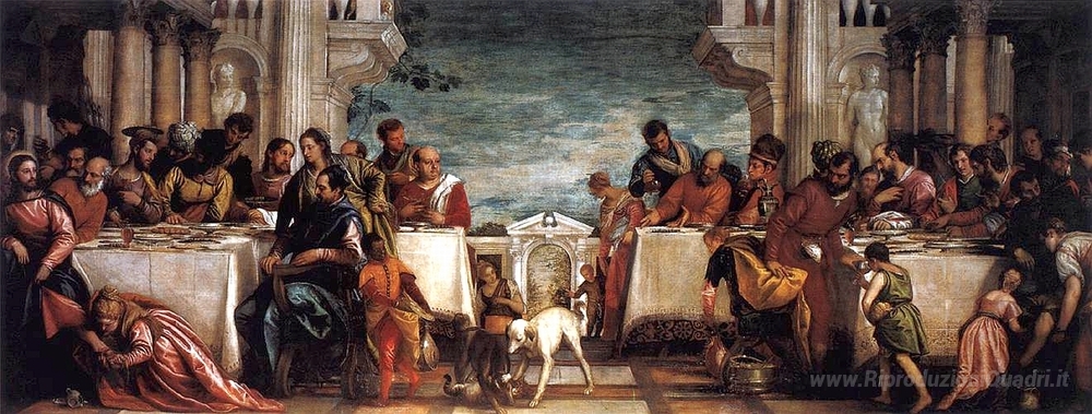 Ti offriamo una riproduzione artigianale su tela dell'opera famosa 'Festa a casa di Simone' di Paolo Veronese, dal Museo delle Riproduzioni.