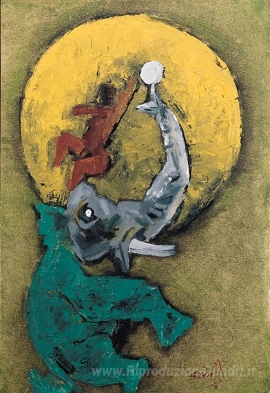Ti offriamo una riproduzione artigianale su tela dell'opera famosa 'Gajagamini' di M.F. Husain, dal Museo delle Riproduzioni.