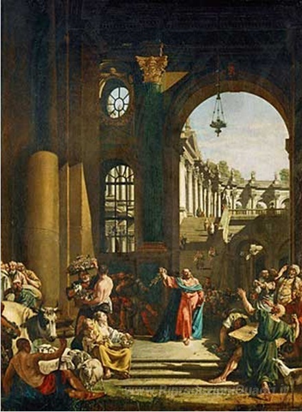 Ti offriamo una riproduzione artigianale su tela dell'opera famosa 'Gesù purifica il tempio' di Bernardo Bellotto, dal Museo delle Riproduzioni.