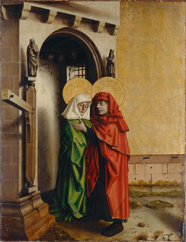 Ti offriamo una riproduzione artigianale su tela dell'opera famosa 'Gioacchino e Anna di fronte al Golden Gate' di Konrad Witz, dal Museo delle Riproduzioni.