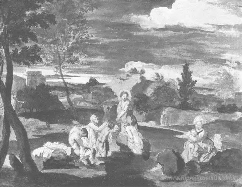 Ti offriamo una riproduzione artigianale su tela dell'opera famosa 'Giovanni Battista battezza persone' di Orest Kiprensky, dal Museo delle Riproduzioni.
