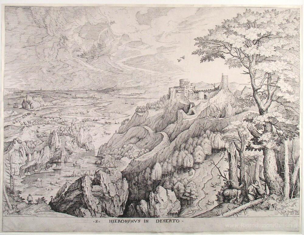 Ti offriamo una riproduzione artigianale su tela dell'opera famosa 'Girolamo nel deserto' di Pieter Bruegel the Elder, dal Museo delle Riproduzioni.