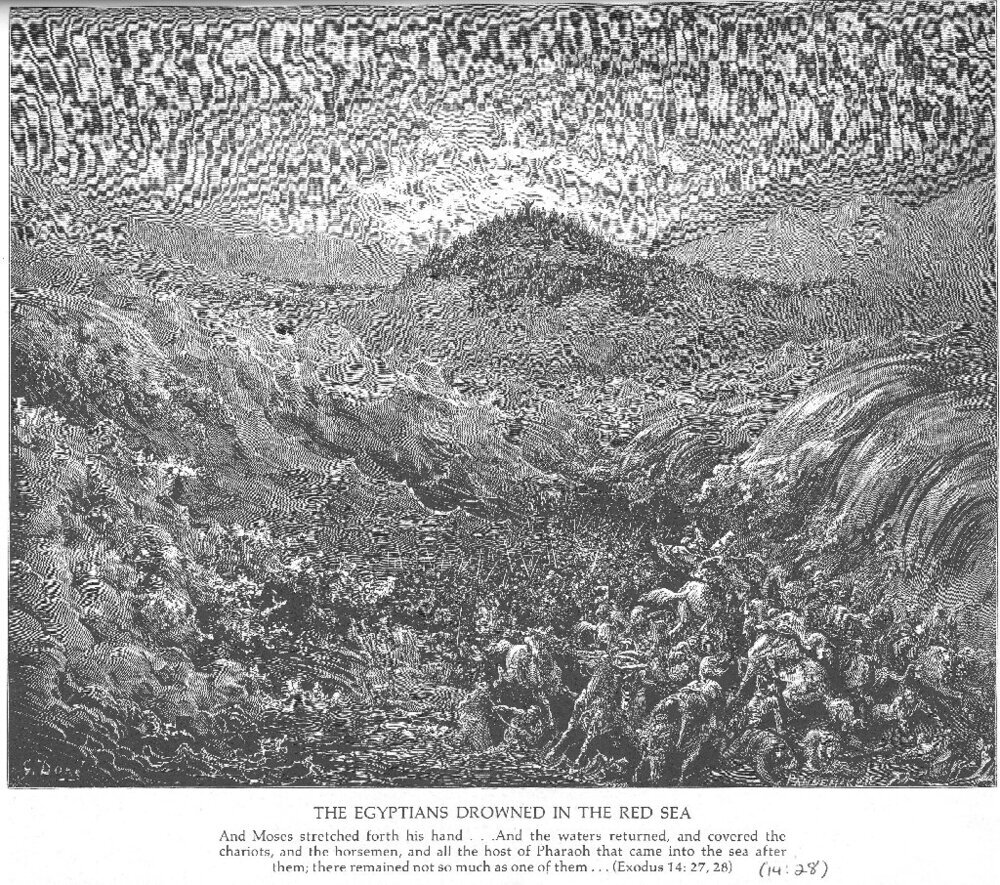 Ti offriamo una riproduzione artigianale su tela dell'opera famosa 'Gli egiziani Drown nel mare' di Gustave Dore, dal Museo delle Riproduzioni.