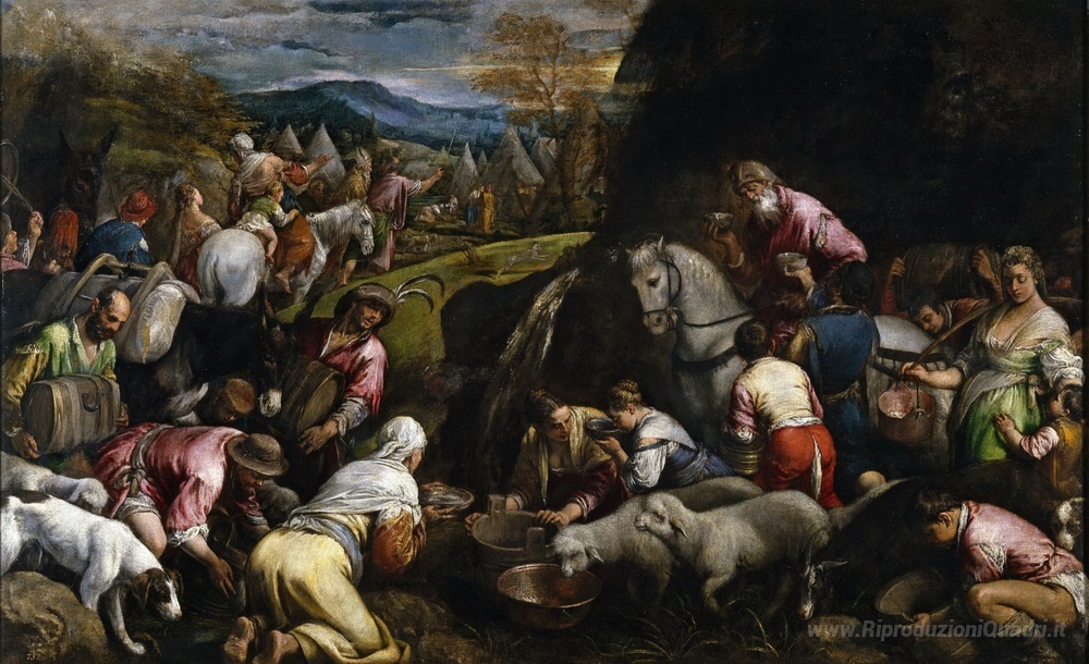 Ti offriamo una riproduzione artigianale su tela dell'opera famosa 'Gli israeliani potabile Miracolosa acqua' di Jacopo Bassano, dal Museo delle Riproduzioni.