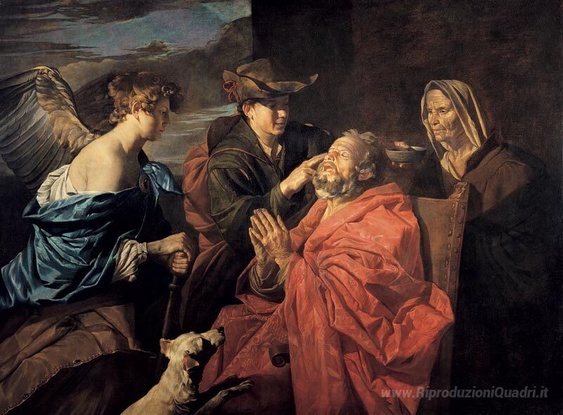 Ti offriamo una riproduzione artigianale su tela dell'opera famosa 'Guarigione di Tobia' di Matthias Stom, dal Museo delle Riproduzioni.