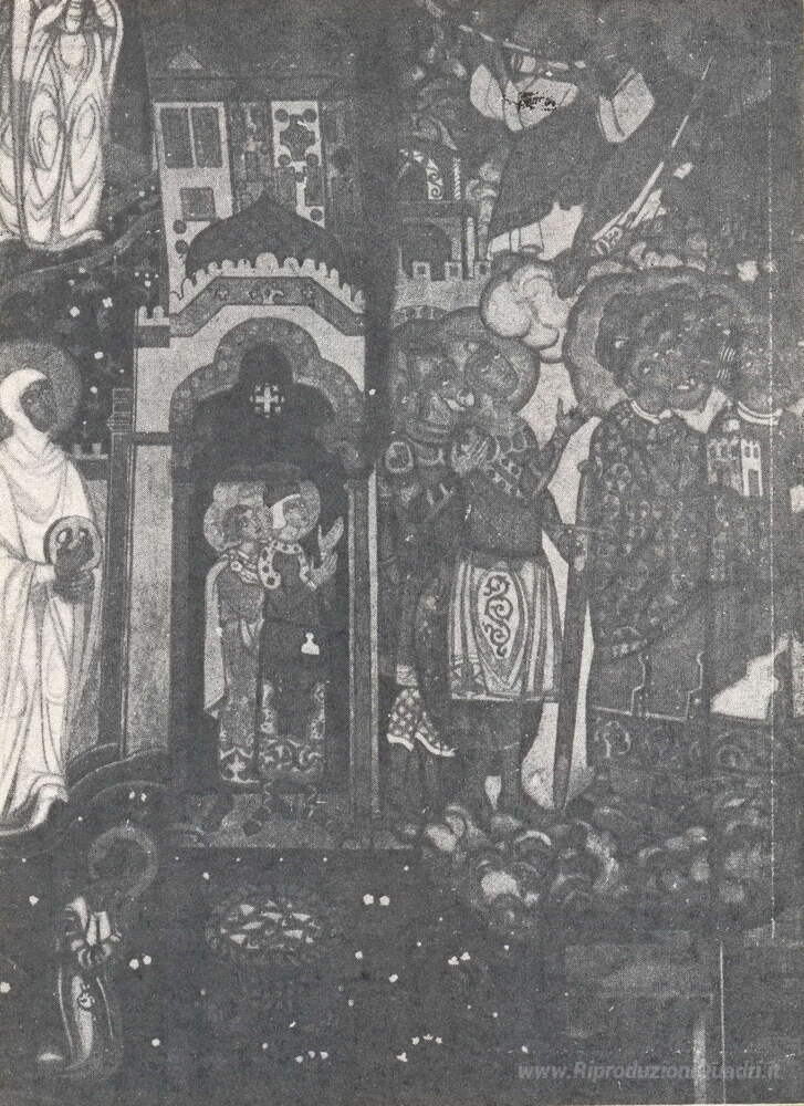 Ti offriamo una riproduzione artigianale su tela dell'opera famosa 'Guerrieri in ginocchio (Studio di dipinti murali per la cappella' di Nicholas Roerich, dal Museo delle Riproduzioni.