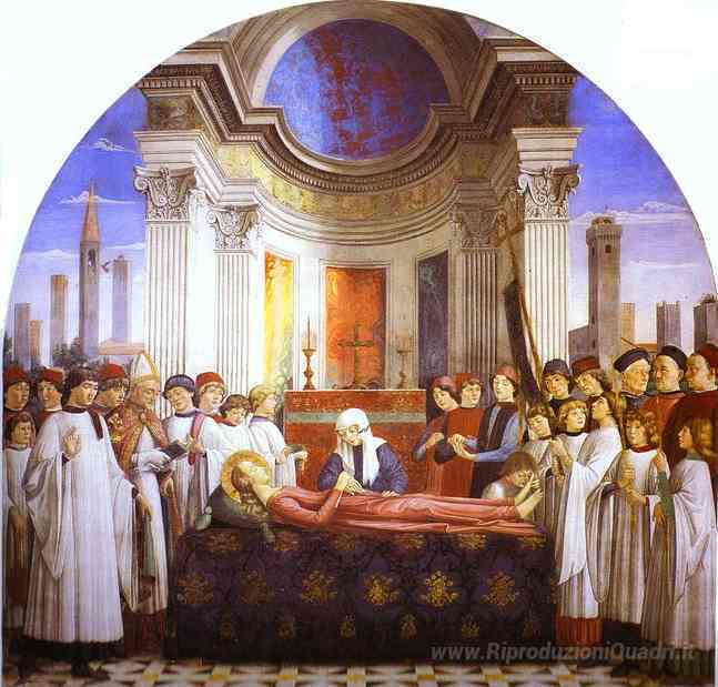 Ti offriamo una riproduzione artigianale su tela dell'opera famosa 'I funerali di S. Fina' di Domenico Ghirlandaio, dal Museo delle Riproduzioni.