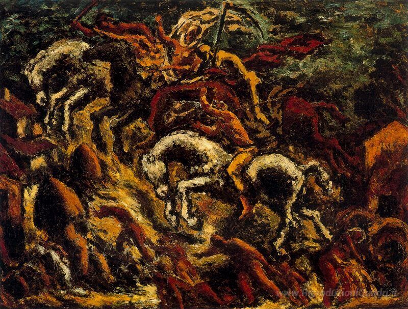 Ti offriamo una riproduzione artigianale su tela dell'opera famosa 'I quattro cavalieri dell'Apocalisse' di Arturo Souto, dal Museo delle Riproduzioni.