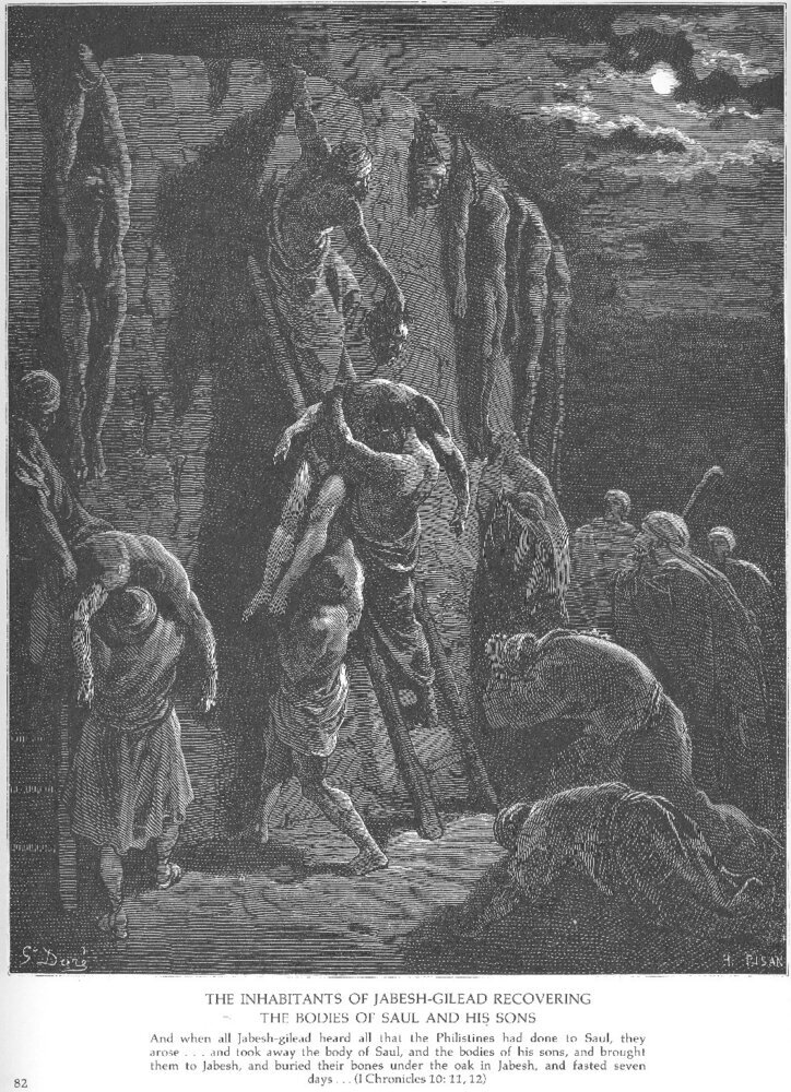 Ti offriamo una riproduzione artigianale su tela dell'opera famosa 'Iabes-Galaad recuperare i corpi di Saul ei suoi figli' di Gustave Dore, dal Museo delle Riproduzioni.
