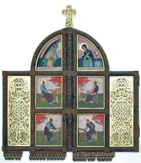 Ti offriamo una riproduzione artigianale su tela dell'opera famosa 'Iconostasi nello Spirito Santo Cappella del Seminario Teologico ' di Petro Kholodny (Elder), dal Museo delle Riproduzioni.