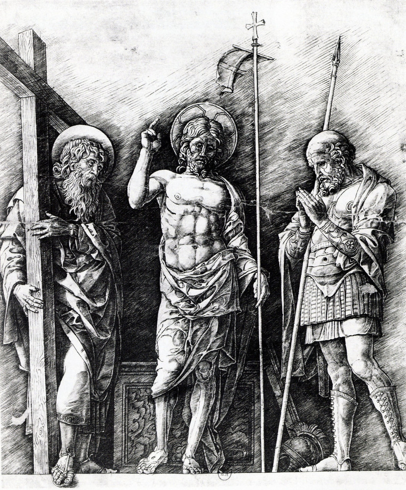 Ti offriamo una riproduzione artigianale su tela dell'opera famosa 'Il Cristo risorto tra S. Andrea e Longino' di Andrea Mantegna, dal Museo delle Riproduzioni.
