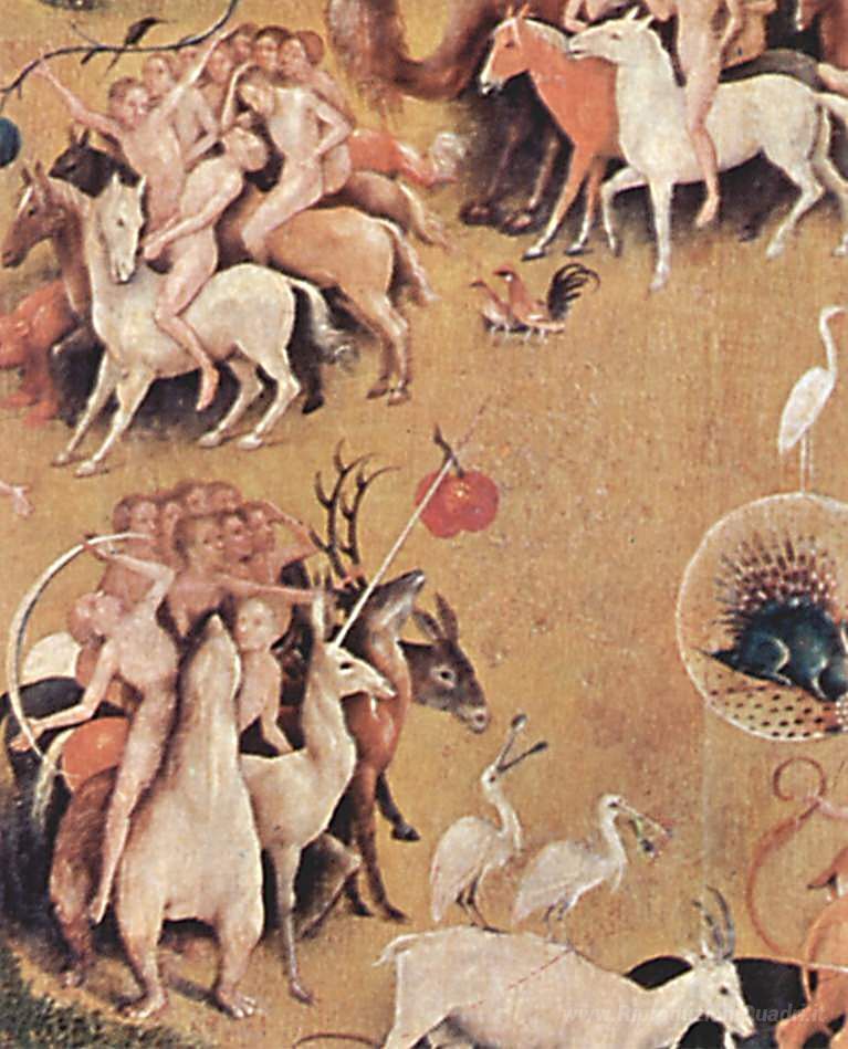 Ti offriamo una riproduzione artigianale su tela dell'opera famosa 'Il Giardino delle Delizie (particolare)' di Hieronymus Bosch, dal Museo delle Riproduzioni.