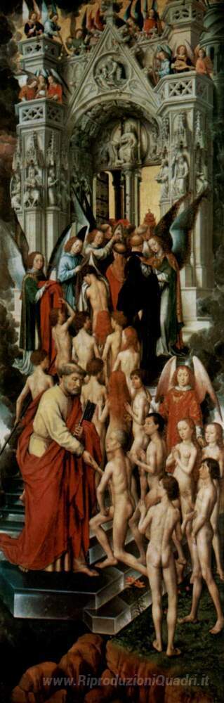 Ti offriamo una riproduzione artigianale su tela dell'opera famosa 'Il Giudizio Universale, trittico, Ala sinistra il Beato alla por' di Hans Memling, dal Museo delle Riproduzioni.