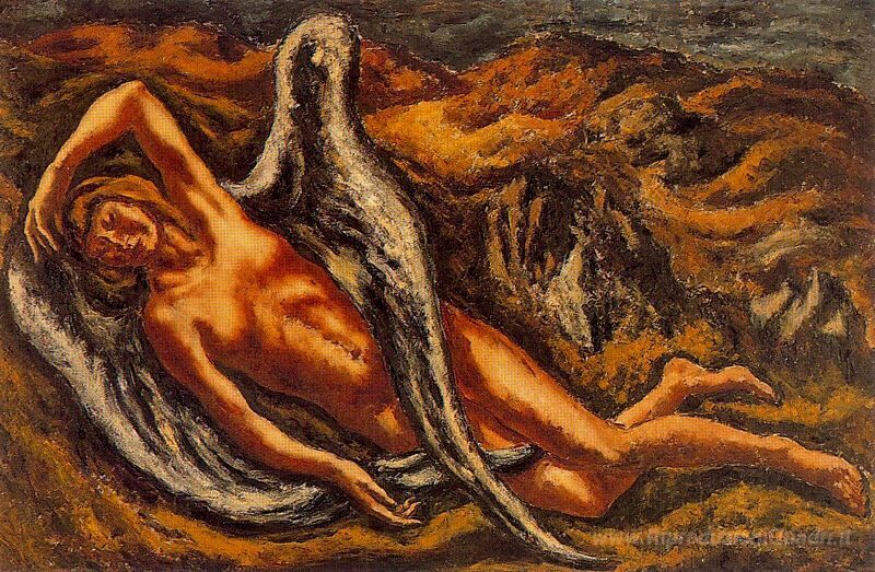 Ti offriamo una riproduzione artigianale su tela dell'opera famosa 'Il Los Angeles caduto (Leda e il cigno)' di Arturo Souto, dal Museo delle Riproduzioni.