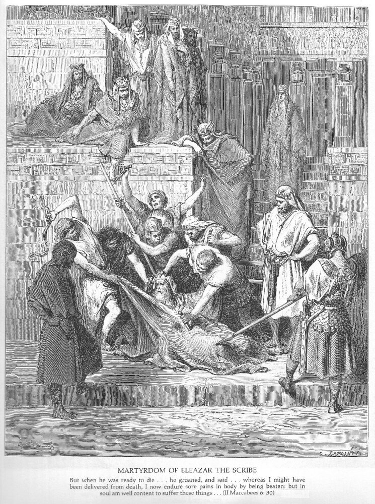Ti offriamo una riproduzione artigianale su tela dell'opera famosa 'Il Martirio di Eleazar Scribe' di Gustave Dore, dal Museo delle Riproduzioni.