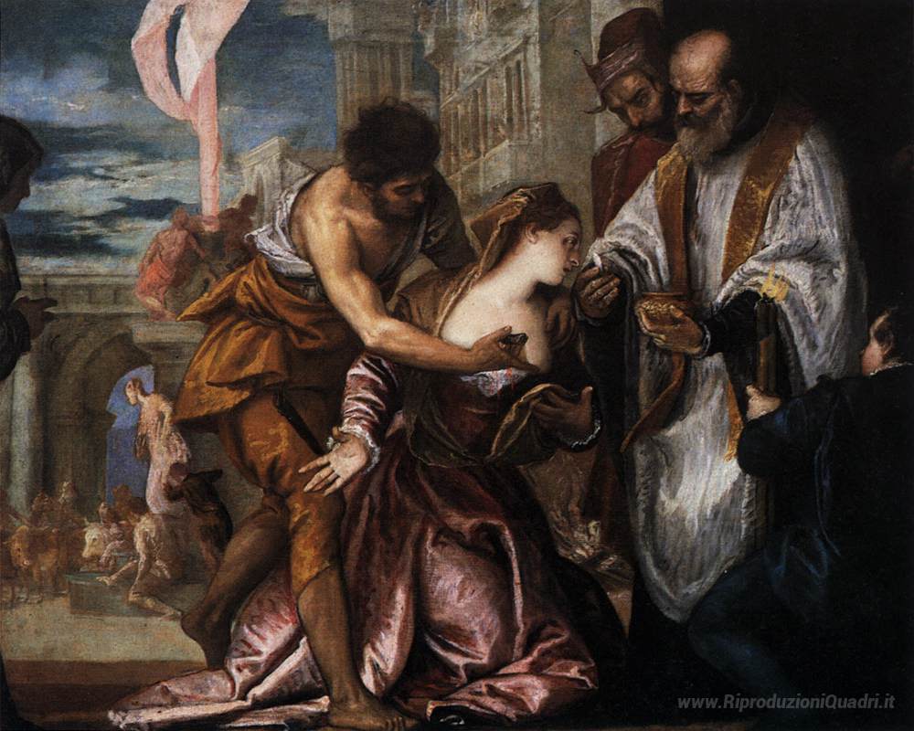 Ti offriamo una riproduzione artigianale su tela dell'opera famosa 'Il martirio e la Comunione di Santa Lucia' di Paolo Veronese, dal Museo delle Riproduzioni.