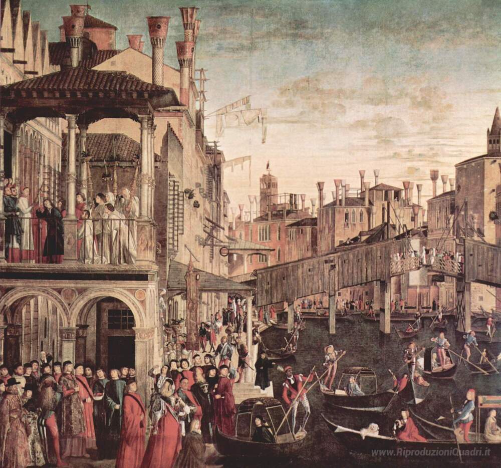 Ti offriamo una riproduzione artigianale su tela dell'opera famosa 'Il miracolo della reliquia della Vera Croce sul ponte di Rialto' di Vittore Carpaccio, dal Museo delle Riproduzioni.