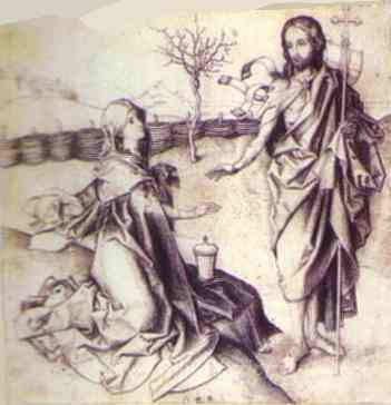 Ti offriamo una riproduzione artigianale su tela dell'opera famosa 'Il nostro Salvatore appare a Maria Maddalena nel Giardino' di Martin Schongauer, dal Museo delle Riproduzioni.