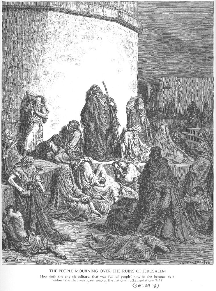 Ti offriamo una riproduzione artigianale su tela dell'opera famosa 'Il Popolo Mourning sulle rovine di Gerusalemme, Lamentazioni 1: ' di Gustave Dore, dal Museo delle Riproduzioni.