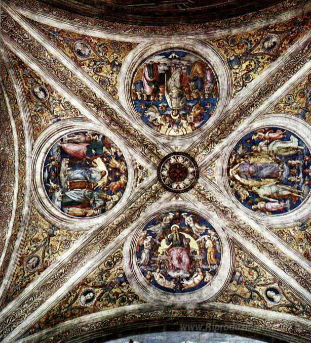 Ti offriamo una riproduzione artigianale su tela dell'opera famosa 'Il soffitto con quattro medaglioni' di Pietro Perugino, dal Museo delle Riproduzioni.