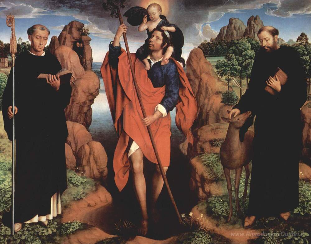 Ti offriamo una riproduzione artigianale su tela dell'opera famosa 'Il trittico di Willem Moreel, pannello centrale San Cristoforo c' di Hans Memling, dal Museo delle Riproduzioni.