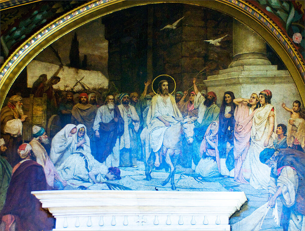 Ti offriamo una riproduzione artigianale su tela dell'opera famosa 'Ingresso a Gerusalemme' di Wilhelm Kotarbinski, dal Museo delle Riproduzioni.