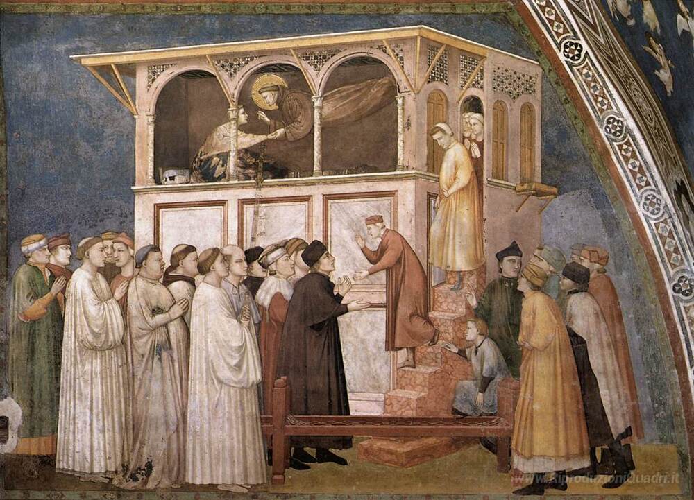 Ti offriamo una riproduzione artigianale su tela dell'opera famosa 'Innalzamento della Boy a Sessa' di Giotto, dal Museo delle Riproduzioni.