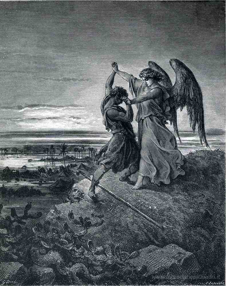 Ti offriamo una riproduzione artigianale su tela dell'opera famosa 'Jacob Wrestling con l'Angelo' di Gustave Dore, dal Museo delle Riproduzioni.