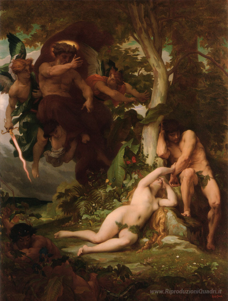 Ti offriamo una riproduzione artigianale su tela dell'opera famosa 'La Cacciata di Adamo ed Eva dal Giardino del Paradiso' di Alexandre Cabanel, dal Museo delle Riproduzioni.