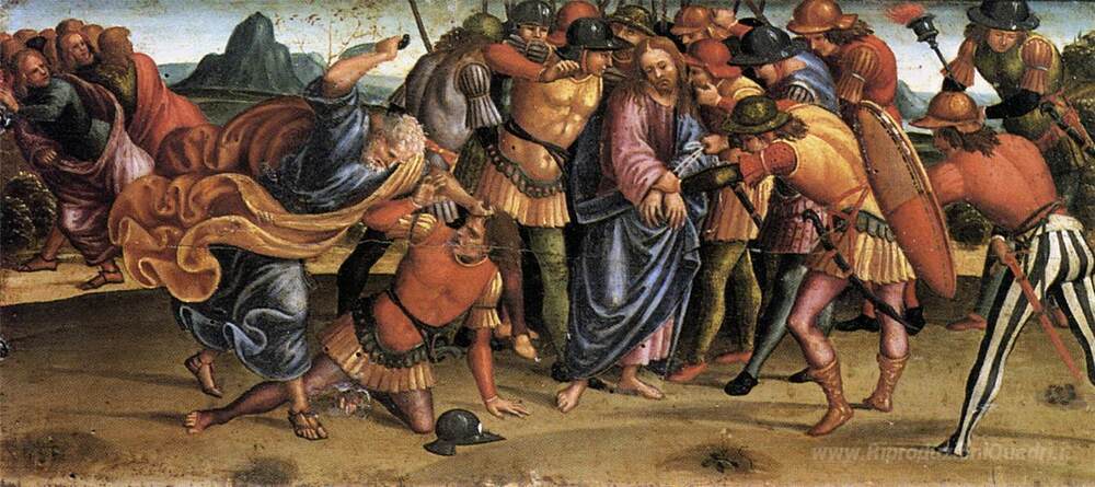 Ti offriamo una riproduzione artigianale su tela dell'opera famosa 'La Cattura di Cristo' di Luca Signorelli, dal Museo delle Riproduzioni.