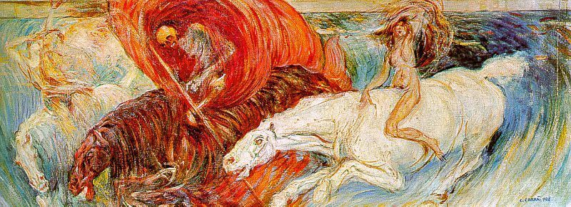 Ti offriamo una riproduzione artigianale su tela dell'opera famosa 'La cavalieri dell'apocalisse' di Carlo Carra, dal Museo delle Riproduzioni.