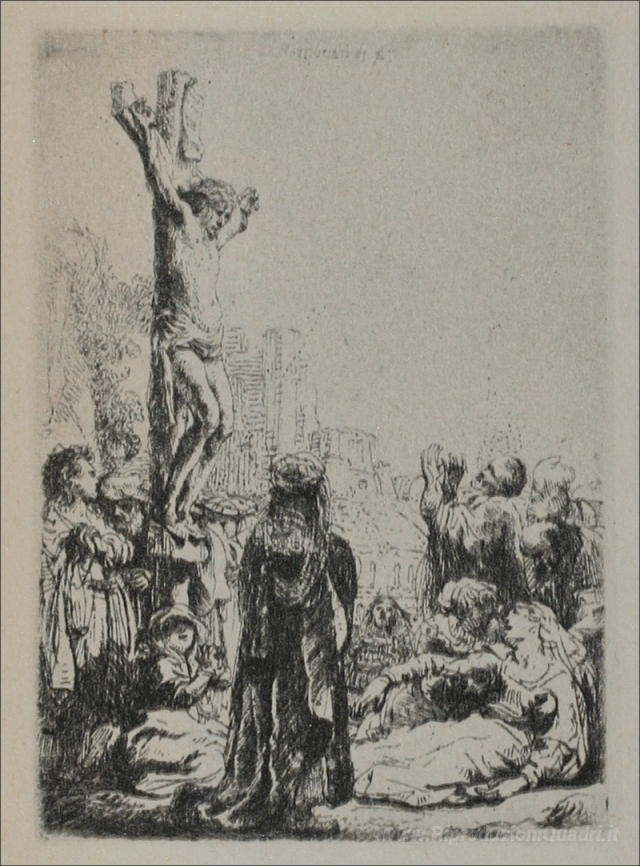Ti offriamo una riproduzione artigianale su tela dell'opera famosa 'La Crocifissione una piazza piccola piastra' di Rembrandt, dal Museo delle Riproduzioni.