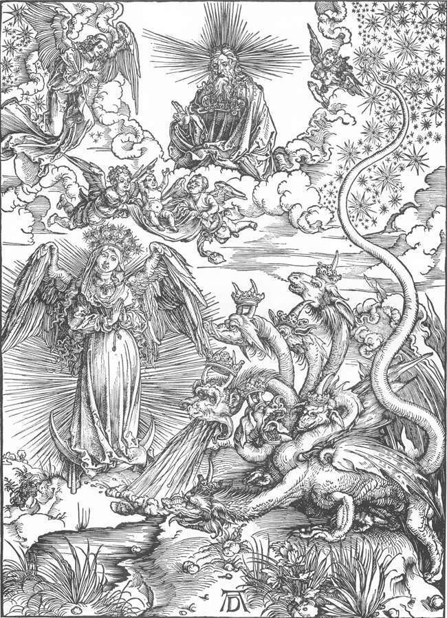 Ti offriamo una riproduzione artigianale su tela dell'opera famosa 'La donna vestita di sole e sette diretto il drago' di Albrecht Durer, dal Museo delle Riproduzioni.