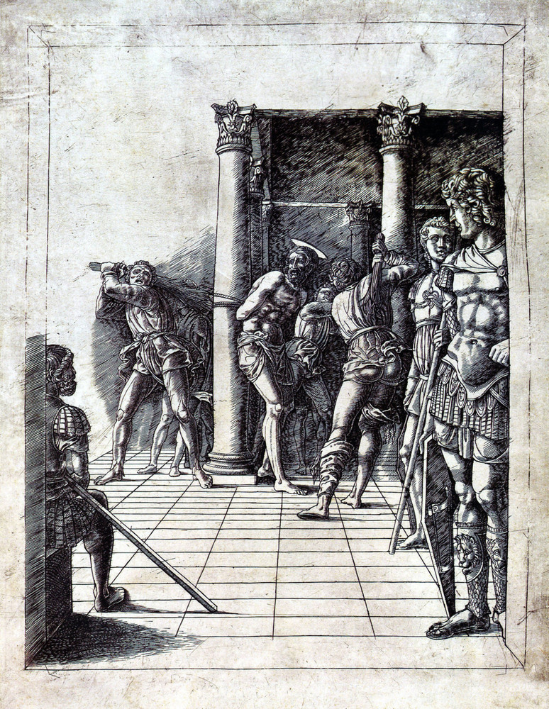 Ti offriamo una riproduzione artigianale su tela dell'opera famosa 'La Flagellazione di Cristo nel pavimento' di Andrea Mantegna, dal Museo delle Riproduzioni.