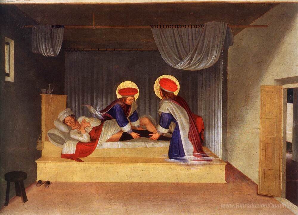 Ti offriamo una riproduzione artigianale su tela dell'opera famosa 'La guarigione di Giustiniano da San Cosma e San Damiano' di Fra Angelico, dal Museo delle Riproduzioni.