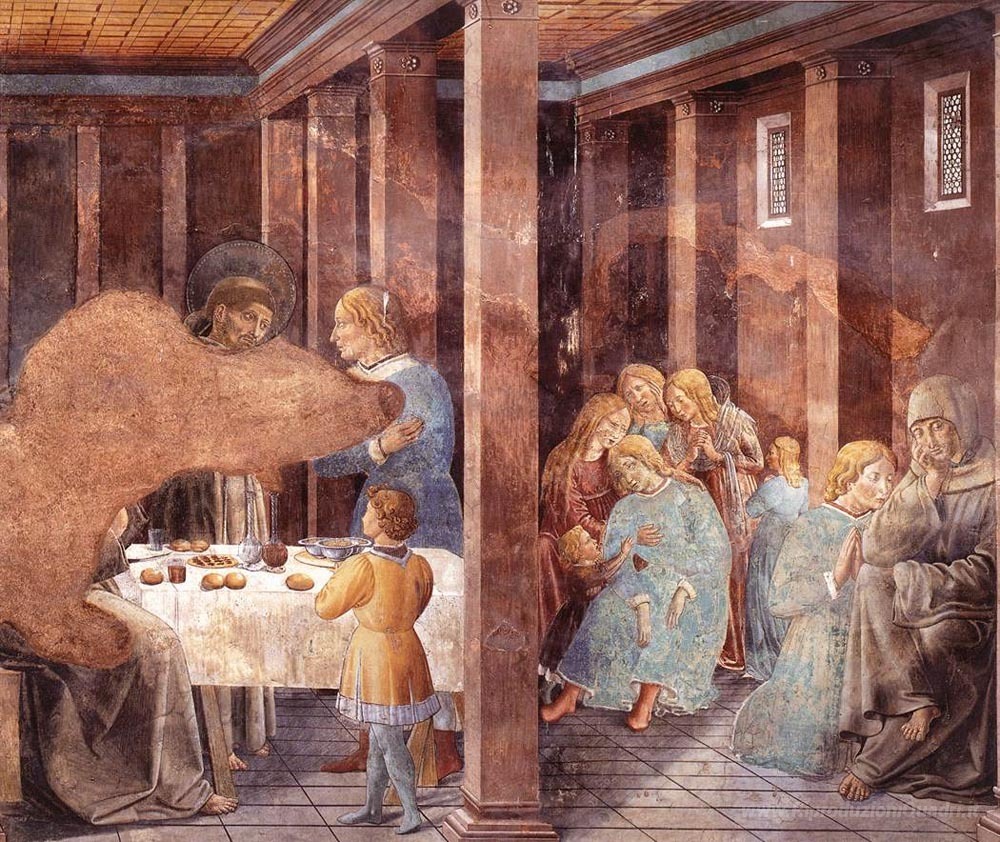 Ti offriamo una riproduzione artigianale su tela dell'opera famosa 'La morte del Cavaliere di Celano' di Benozzo Gozzoli, dal Museo delle Riproduzioni.