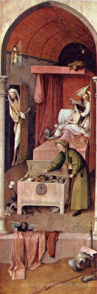 Ti offriamo una riproduzione artigianale su tela dell'opera famosa 'La morte e la Avaro' di Hieronymus Bosch, dal Museo delle Riproduzioni.