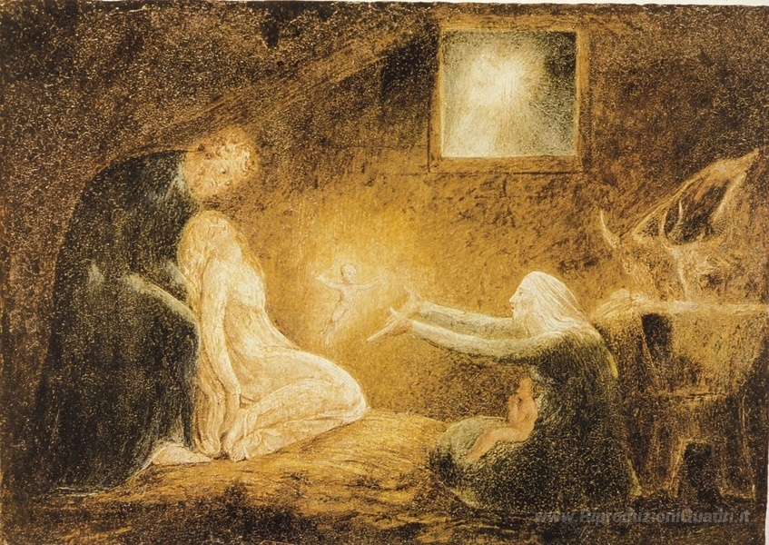 Ti offriamo una riproduzione artigianale su tela dell'opera famosa 'La Natività' di William Blake, dal Museo delle Riproduzioni.