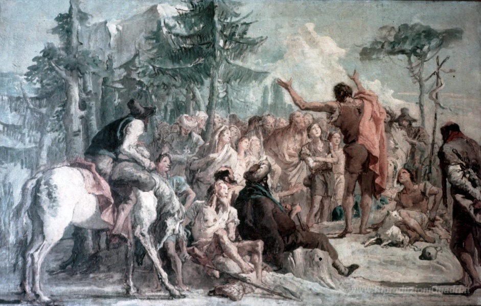 Ti offriamo una riproduzione artigianale su tela dell'opera famosa 'La predicazione di Giovanni Battista' di Giovanni Domenico Tiepolo, dal Museo delle Riproduzioni.