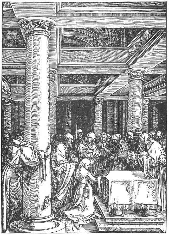 Ti offriamo una riproduzione artigianale su tela dell'opera famosa 'La Presentazione di Gesù al Tempio' di Albrecht Durer, dal Museo delle Riproduzioni.