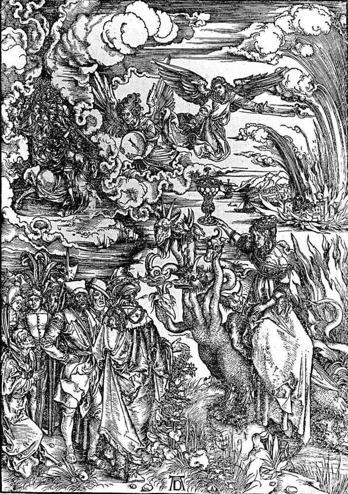 Ti offriamo una riproduzione artigianale su tela dell'opera famosa 'La puttana di Baylon' di Albrecht Durer, dal Museo delle Riproduzioni.