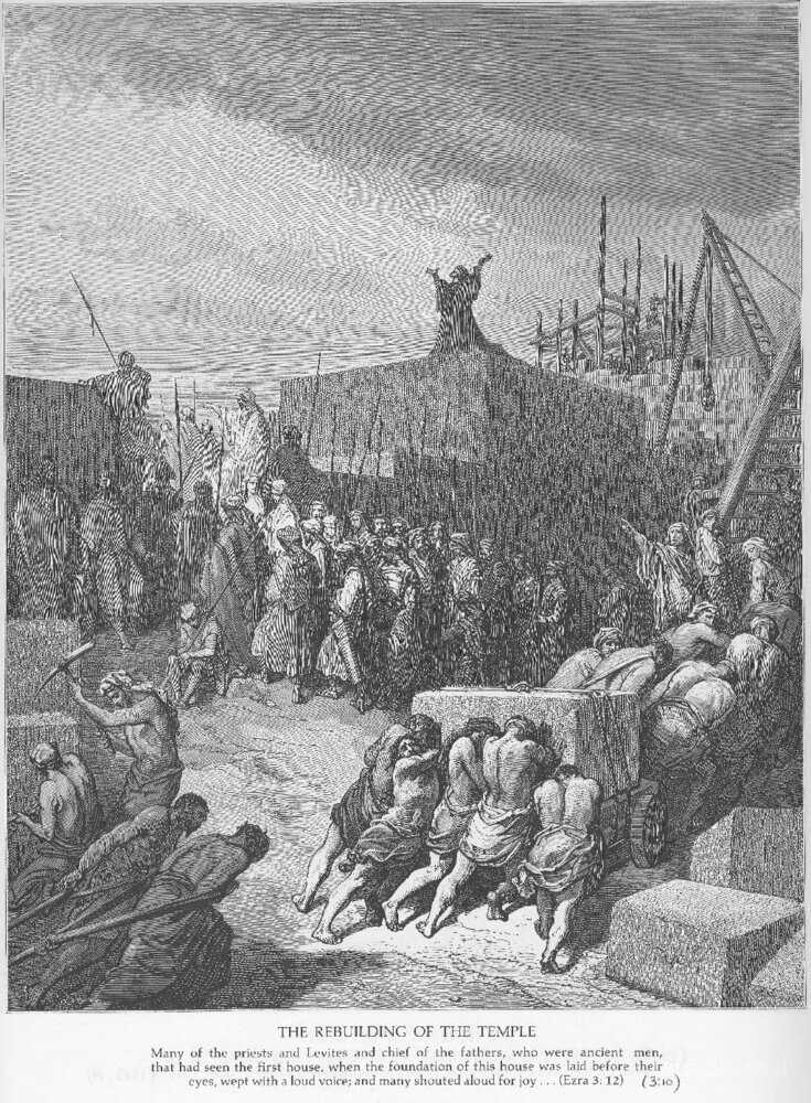 Ti offriamo una riproduzione artigianale su tela dell'opera famosa 'La ricostruzione del Tempio è iniziato' di Gustave Dore, dal Museo delle Riproduzioni.