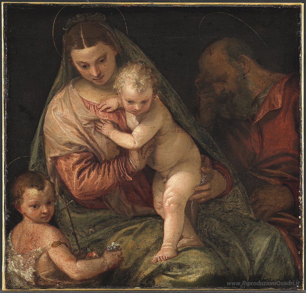 Ti offriamo una riproduzione artigianale su tela dell'opera famosa 'La Sacra Famiglia con il Bambino San Giovanni Battista' di Paolo Veronese, dal Museo delle Riproduzioni.