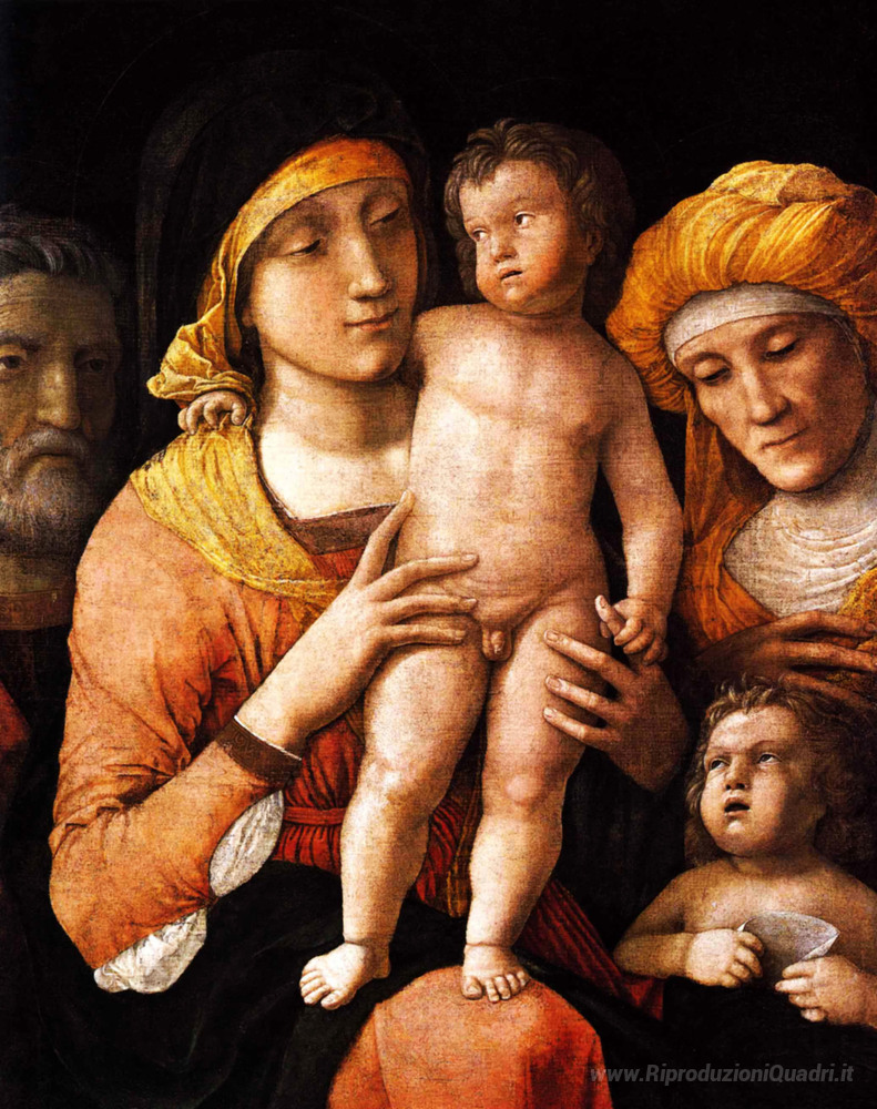 Ti offriamo una riproduzione artigianale su tela dell'opera famosa 'La Sacra Famiglia con Santa Elisabetta e San Giovanni Battista' di Andrea Mantegna, dal Museo delle Riproduzioni.